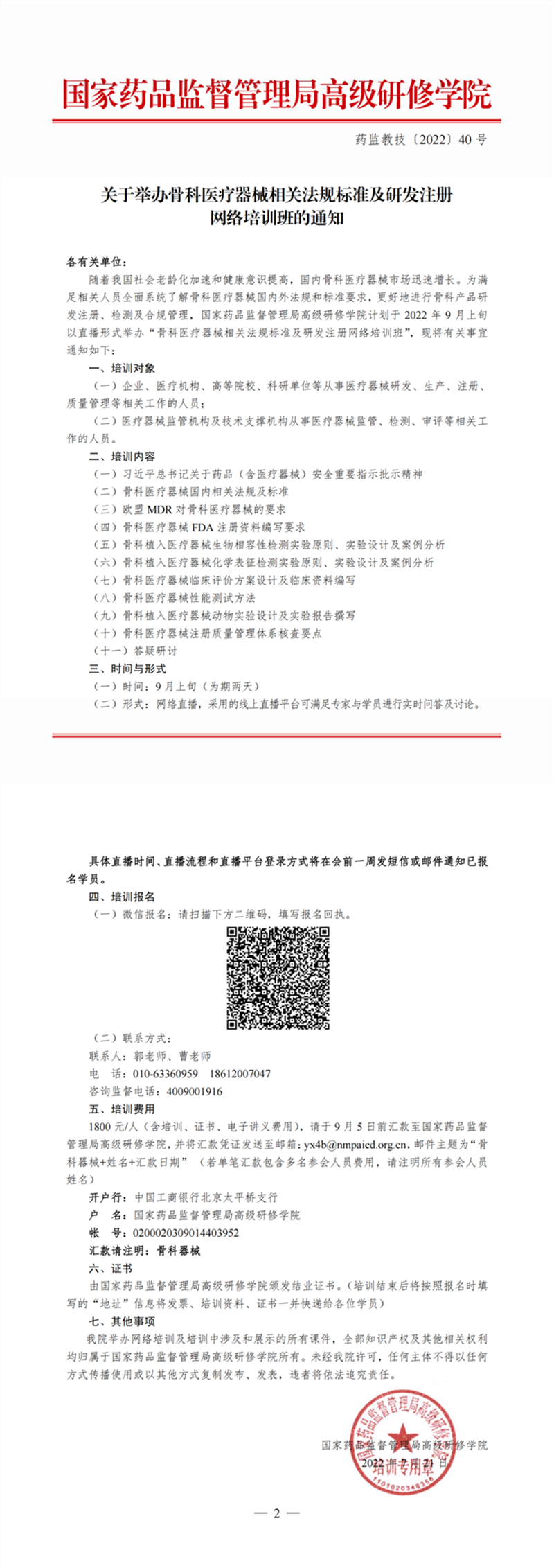1800元/人(含培训、证书、电子讲义费用),请于9月5日前汇款至国家药品监督管理局高级研修学院,并将汇款凭证发送至邮箱:yx4b@nmpaied.org.cn,邮件主题为“骨科器械+姓名+汇款日期” (若单笔汇款包含多名参会人员费用,请注明所有参会人员姓名)